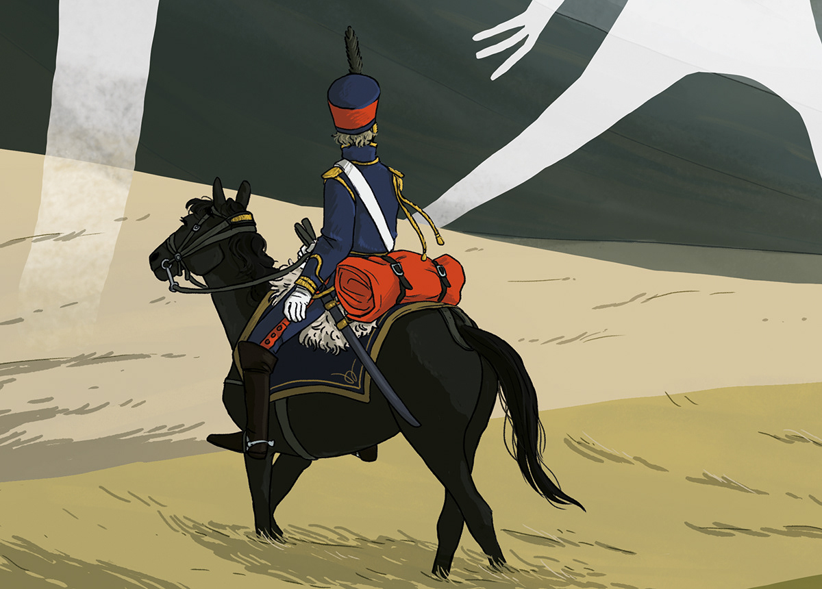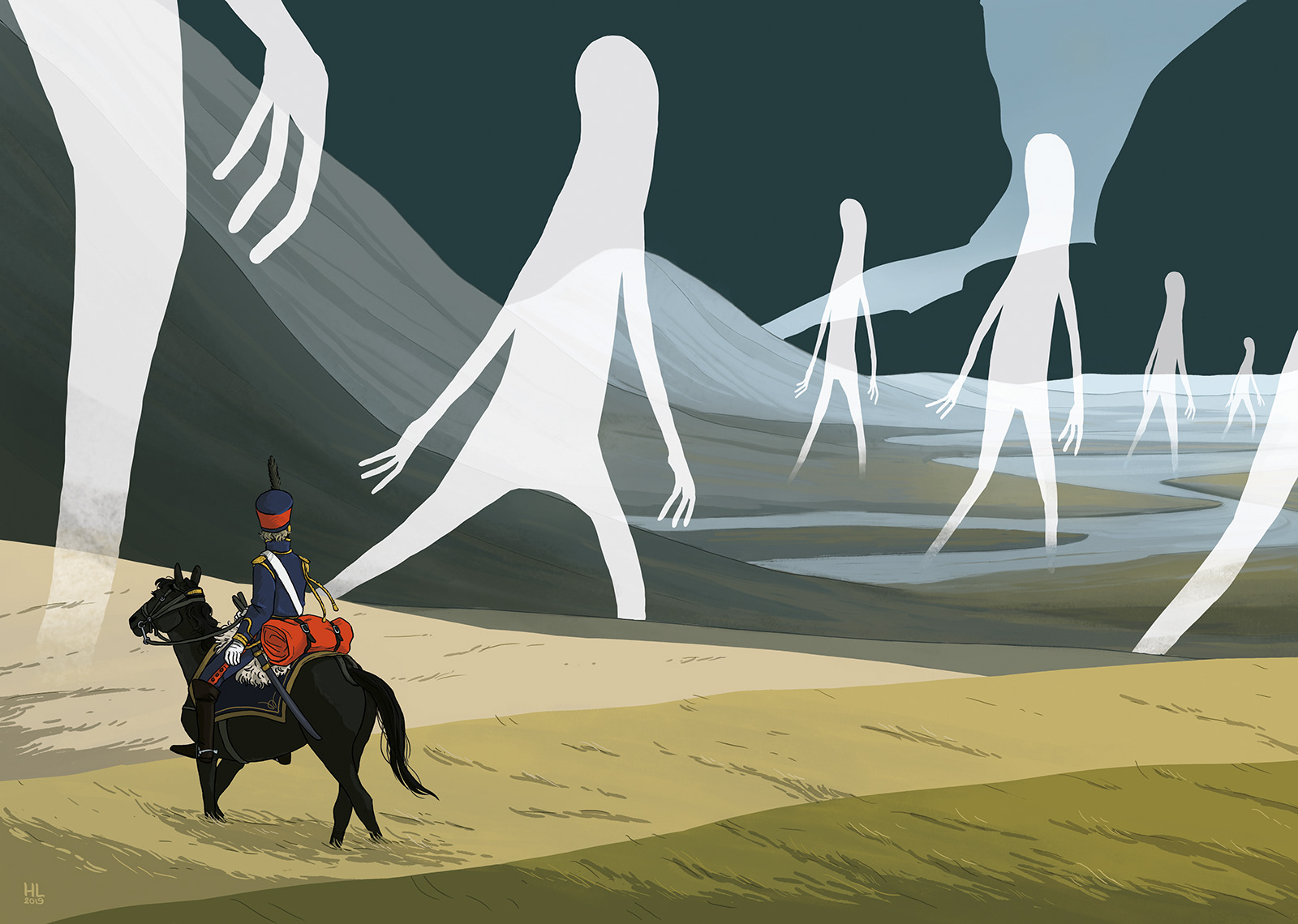 Kuvitus husaarista, joka kohtaa partiollaan joukon vaeltavia henkiolentoja. Kuvituksella halusin harjoitella tarinankerrontaa ja kompositiota.